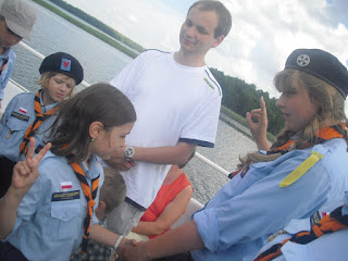 Apel. Robimy śniadanie. Jedziemy na wycieczkę! na początku zwiedzaliśmy Katedrę (w Świętej Lipce - grające, ruszające się organy), potem poszliśmy na wieżę (w Reszlu) tam Lidka złożyła Obietnicę. Następnie byliśmy w parafii ks. Patryka i w lochach (to już Kętrzyn), później obiad. Zobaczyliśmy osła. Potem byśmy na statku. Zdała Aga Mizerska. Wróciliśmy i zjedliśmy kolację przy ognisku (*kiełbaska).